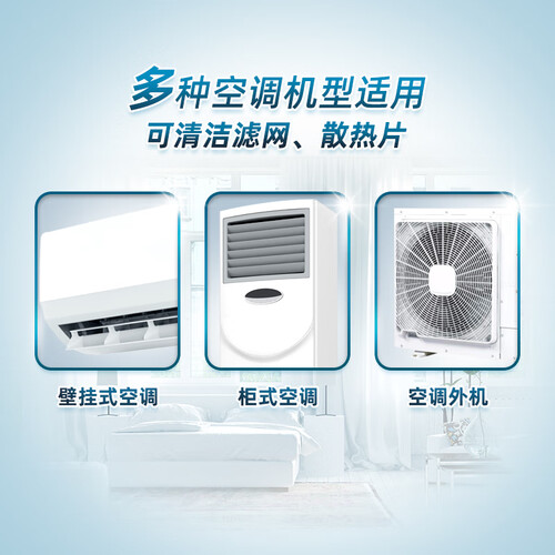 免拆洗设计,操作简单快捷,轻松去除空调内部污垢,吹出洁净空调风,家人呼吸更健康;温和配方,不腐蚀内部金属零件,历久弥新。
