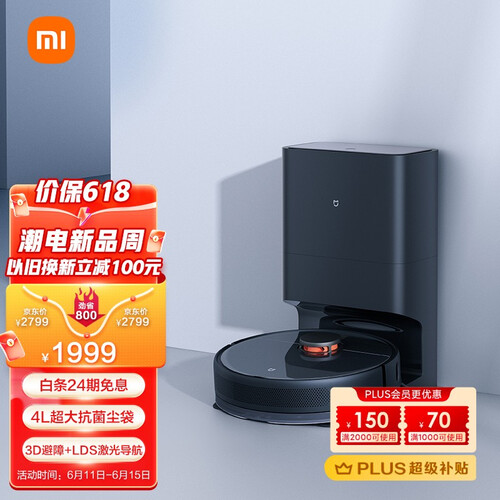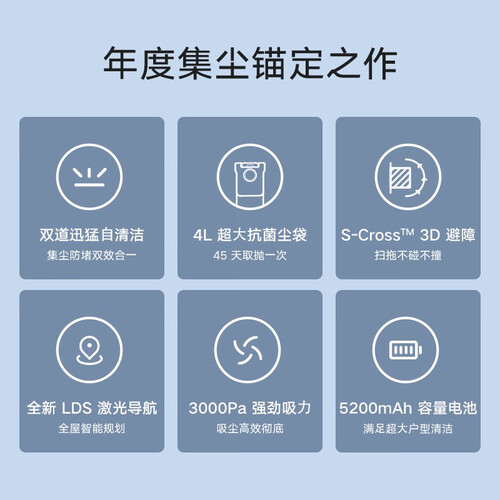 智慧除尘功能,可自动清空尘盒垃圾,清洁不脏手;3D避障技术,精准感知周围环境,主动避障;LDS激光导航功能,智能规划全屋清洁。
