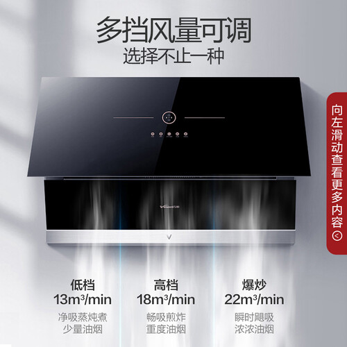 大直径叶轮、高转速电机、仿生扰流风道,风量更大,性能更强,降低噪音。台嵌两用式设计,满足不同厨房使用。