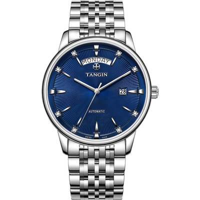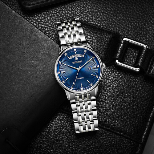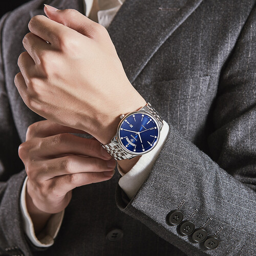 时尚沉稳的蓝色表盘配合银色表带,妥妥的商务风,轻松帮你驾驭各个场合。闪耀的钻饰点缀,为手表增添了一丝时尚感,上手有看点。