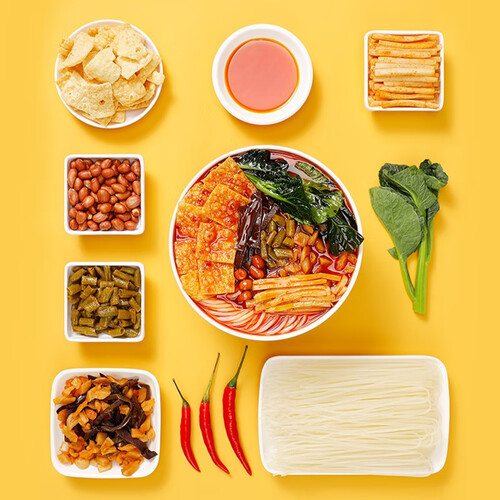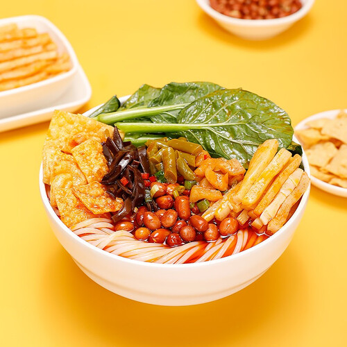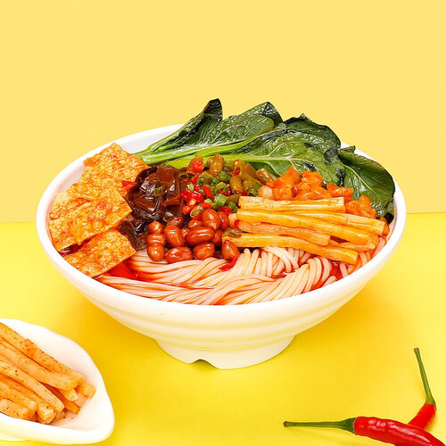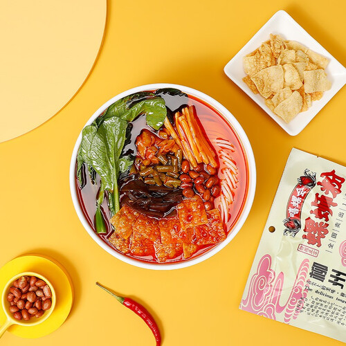 辣椒油红润透亮,为简单的螺蛳粉增色提香,令人爱不释口。粉质顺滑弹韧,一口嗦下去,瞬间征服您的胃。