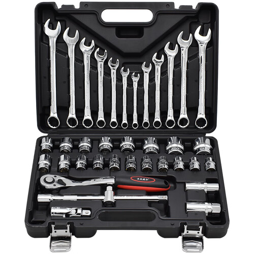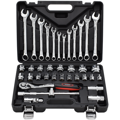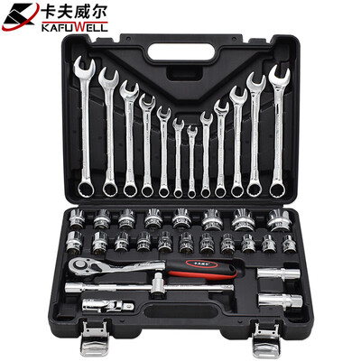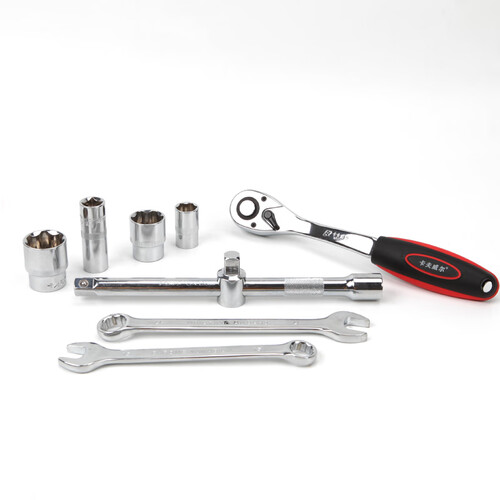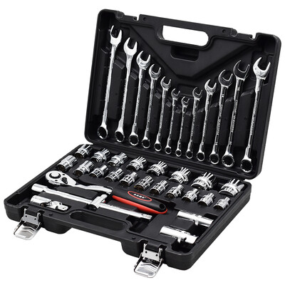 内置棘轮、万向接头、加长杆等工具,全部整齐收纳在工具箱内,可用于汽修的安装拆卸。