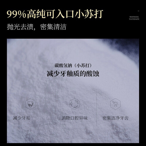 小苏打成分,能减少牙釉质的酸蚀,去除口腔异味,深层清洁牙齿。植物萃取的清火配方,有效舒缓口腔上火和牙龈不适等问题。