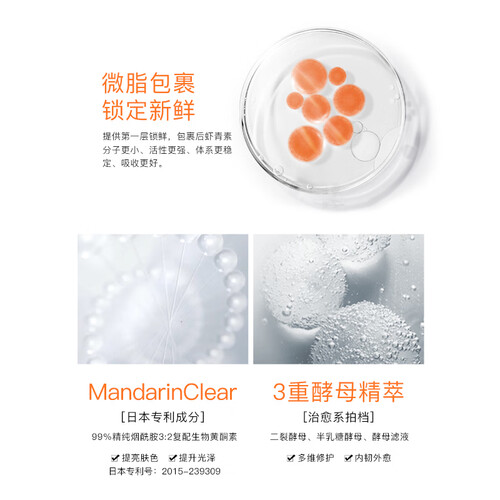 微脂包裹锁定新鲜,提供第一层锁鲜,包裹虾青素分子更小、活性更强、体系更稳定、吸收更好,烟酰胺复配成分提亮效果加成。