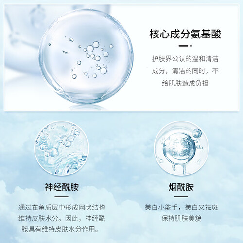 复配高纯度烟酰胺,纯度高,温和呵护脆弱肌,护肤效果更有效。添加温和的氨基酸配方,温和清洁肌底,让肤质更光滑细腻。