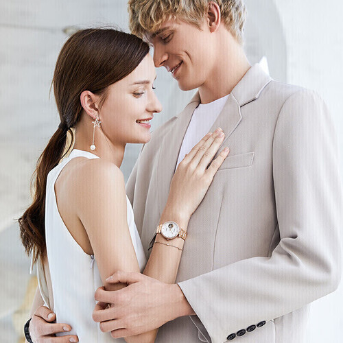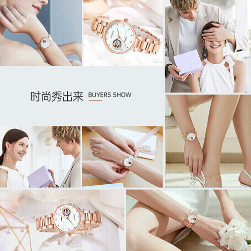 表圈镶嵌了70颗闪耀锆钻,搭配精湛的爪镶工艺,美观大气,不易掉钻;自然母贝表盘搭配玫瑰金表壳,白金配色清新自然。