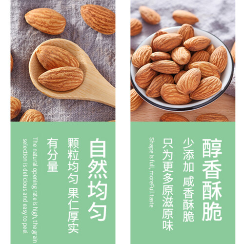 严格把控生产车间的卫生与安全,产品质量更有保障,可以放心食用。挑选大颗粒的巴旦木仁,每日食用满足身体的需求。
