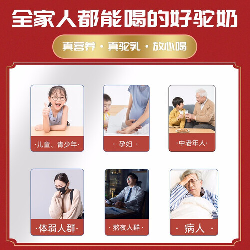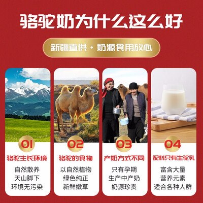 源自新疆原生态自然放养的双峰骆驼,拥有更加均衡全面的营养元素,特有的营养价值,非常适合中老年人及儿童补充营养饮用。