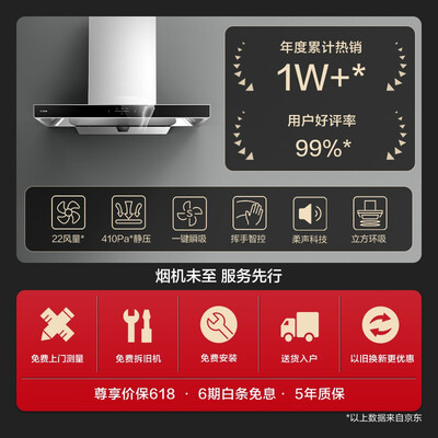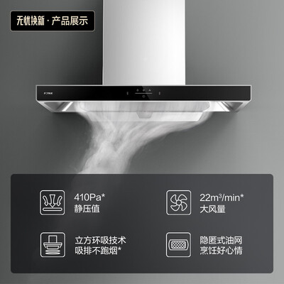 每分钟22立方米的大风量,加上强劲的风压,为你打造无烟的健康厨房。无繁琐的按键操作,挥手就能开机和排烟,避免误启动。
