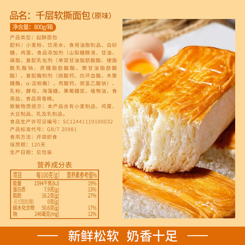 优选原料制成,外表呈金黄的色泽,可以撕出清晰的纹理。散发浓郁的奶香味,入口松软细腻,清甜好吃,适合多种场合食用。