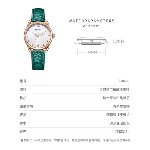 由人工合成蓝宝石玻璃制成的表镜,质地温润通透,光泽感强,并具有优异的防刮耐磨性能,久戴不易刮花表面。