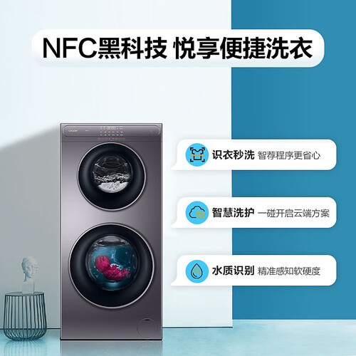 轻触洗衣机NFC区域,能够搭配智能APP互联使用。搭载实时检测系统,能够根据衣物情况进行调节,实现衣物真正的洁净。