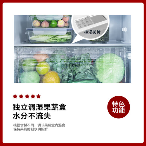 特色调湿果蔬盒设计,保持果蔬食材水分不流失,锁住新鲜。智能循环送风,全方位风冷呵护食物,避免结霜结冰。