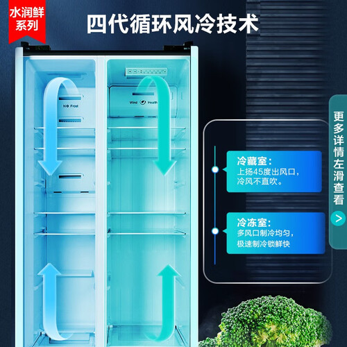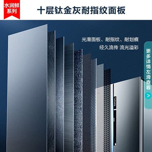 采用十层次钛金灰材料耐划痕面板,光滑面板,手感舒适。优化风路设计,助力箱内冷气实现均匀覆盖,储鲜方便。