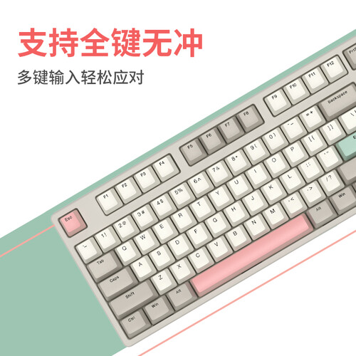 采用PBT材质的键帽设计,不易沾上汗液,不打油还耐用。支持全键按键无冲的贴心设计,提升输入效率,精准依旧。