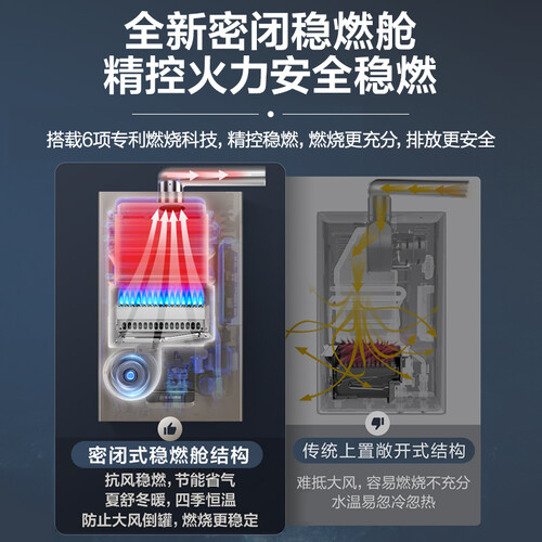 密闭式稳燃舱结构,确保火苗更稳定,燃烧更充分。±0.1℃零肤感恒温洗浴,告别忽冷忽热,水温更舒适。轻音低噪运行,不扰生活。