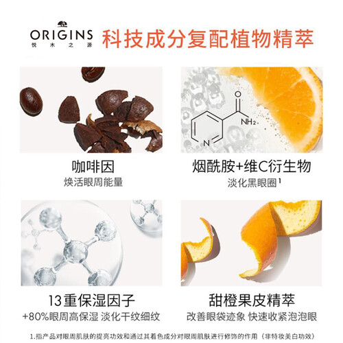 添加咖啡因成分,舒缓肿泡眼,可起到放大双眸的作用。蕴含烟酰胺+维C衍生物成分,协同改善熊猫眼,去黑焕亮。