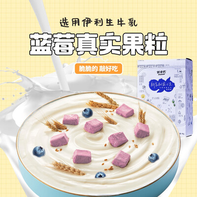 通过真空冷冻干燥工艺去除酸奶中的水分,保留充足营养和美味。加入的蓝莓果粒使制成的冻干十分香甜可口。