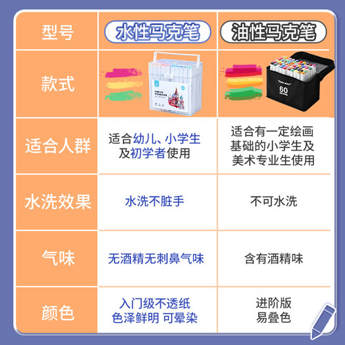 此款为水性马克笔,弄脏双手后,易清理干净,方便您的使用。笔头耐磨不起毛,出墨顺畅,绘画时体验感更好。