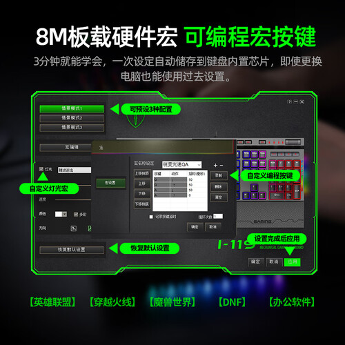 自带LED炫彩背光系统,可自行设定灯光效果。外表采用加厚金属面板,磨砂的质地让你手感舒适,同时稳固耐用。