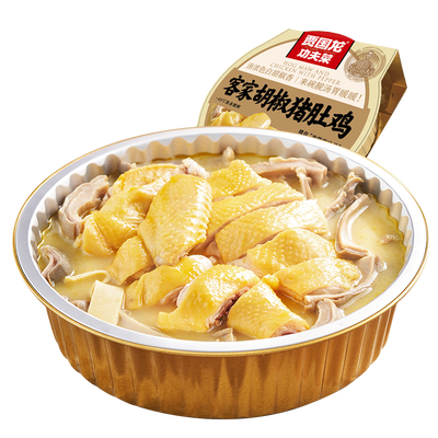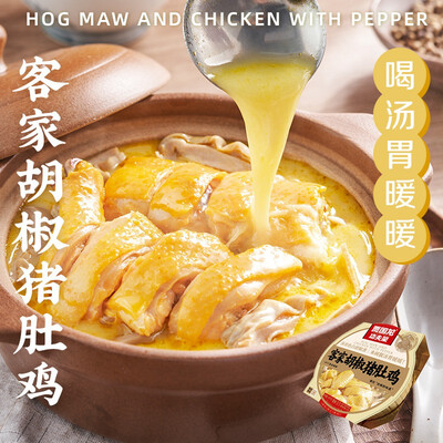 客家地区酒席常备餐前汤,6小时慢炖老母鸡汤打底,浓郁色白带有白胡椒香气。大块猪肚脆嫩无腥气,鸡肉嫩滑令人胃口大开。