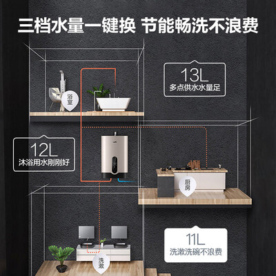 智能恒温燃气热水器,控制水气配比,防止水温波动刺激肌肤。一键切换水量设计,按需使用,节能不浪费。