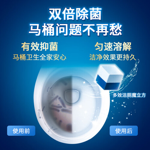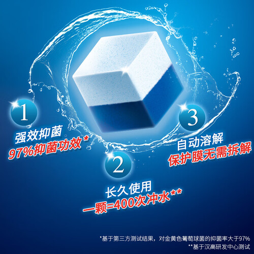 多效合一的配方只需一颗就能清洁到位,能够抑制97%的细菌滋生,持久清新祛味;匀速溶解污垢洁净效果更持久。