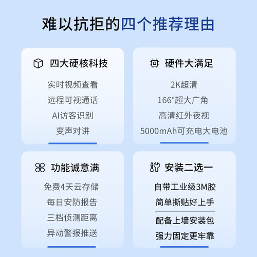 2K高清广角设计,166度宽广视野,门外情况一目了然,掌握情全面更加安全。支持远程可视通话,方便查看来客身份,便捷沟通。