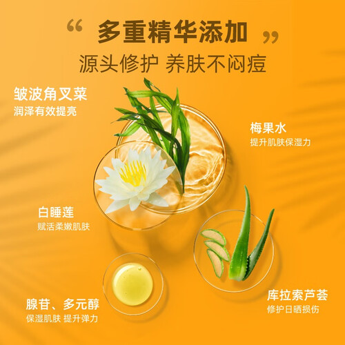 成分中不添加油,因此质地格外的清爽舒适,能够保持哑光的效果。而且添加了6大修复精华,呵护晒后受损的肌肤。