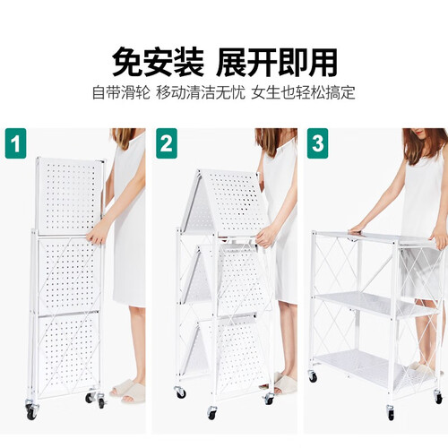 大容量设计,这款置物架含有较大容量,可收纳较多日常杂物,释放室内空间。可折叠设计,收到货后无需安装,展开便可使用。