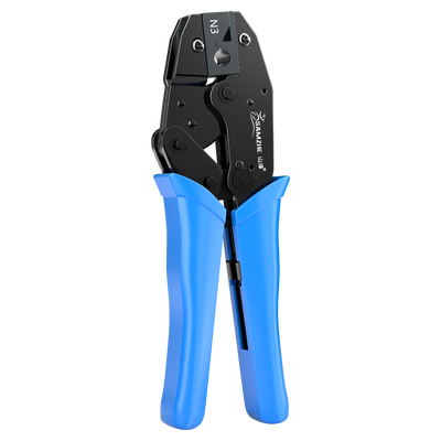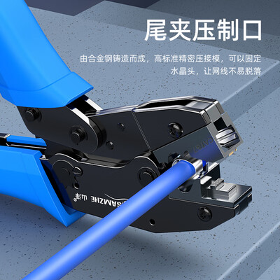 尾夹压制口采用合金钢铸造,具有很高的精密度,有效固定水晶头。设有齿轮卡扣,轻推即可推开,使用方便省力。