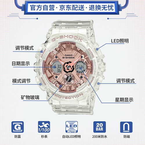 创新采用透明表身,配合玫瑰金色表盘,炫酷中不失优雅腔调。机身支持200米防水,无惧水渍影响,游泳也能戴。