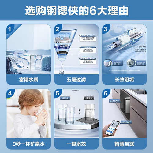 内置矿化滤芯,使出水富含锶元素,补充人体微量元素。采用双出水设计,兼顾纯水饮用泡茶和净水洗菜淘米等不同用水需求。