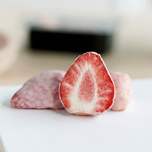 在低温冷冻真空状态下去除水果的水分,保留其原有的清新香甜。外包裹一层酸奶涂层,入口酸甜适中,好吃不黏牙。