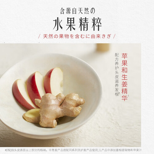 不添加矿物油成分,头皮无负担,洗出无屑、无油清爽秀发。姜根与水果成分的融合,头发更加丰盈,发丝不再脆弱易断。