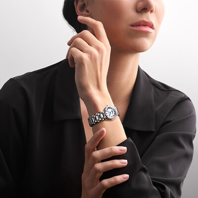 此款手表采用采撷皓月的造型设计,线条柔美圆润,凸显纤细手腕;搭配极简银色表盘,典雅高贵,彰显女性知性气质。