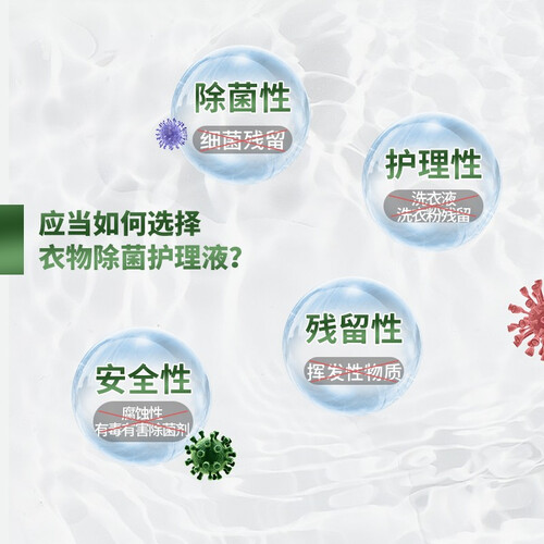 专为衣物除菌设计,有效除菌99.9%,呵护您的居家生活;温和配方,呵护衣物纤维,不刺激皮肤,抚平织物毛躁,带走洗衣残留。