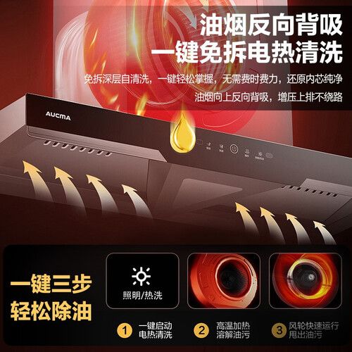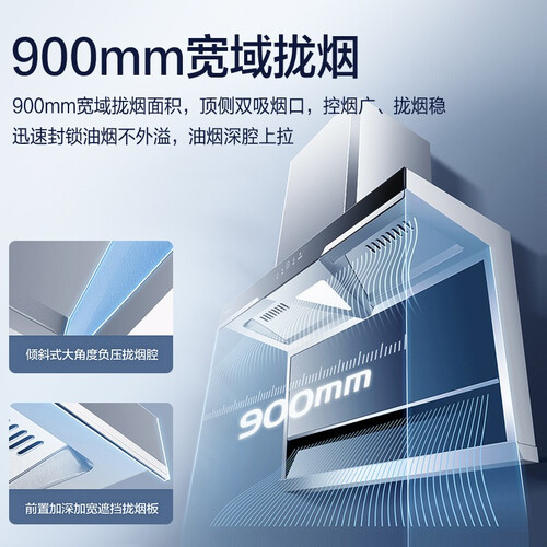 免拆洗电热清洁,一键开启轻松便捷,省时省力解放双手。900mm宽域拢烟设计,搭配双吸烟口,有效锁住油烟不外溢。
