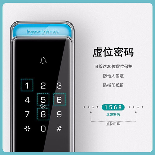 优选半导体指纹设计,智能识别,使用安全更便捷。长达20位虚位密码保护,防止他人偷窥,不易留下常用指印。
