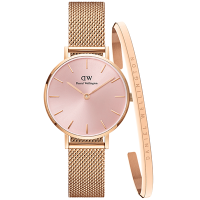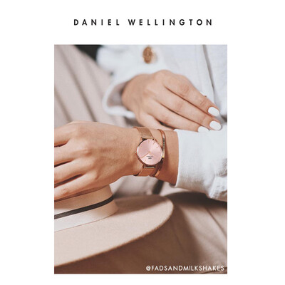 金色精钢表带,粉色圆形表盘,表底品牌logo印刻。
