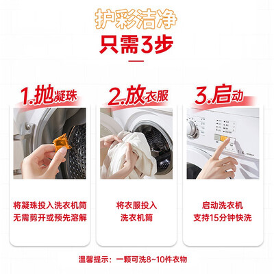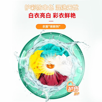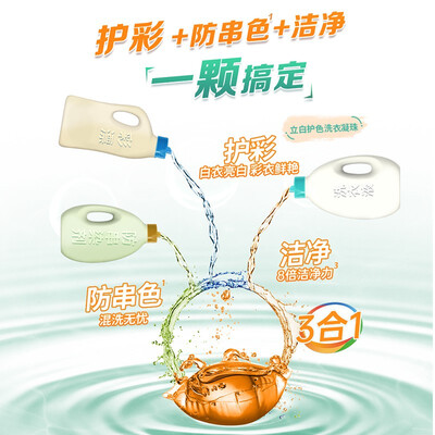具有固色防串色特点,大批鲜艳衣物安心混洗,减少染色和掉色困扰。搭配浓缩配方,一颗能洗大量衣物,符合节约理念。