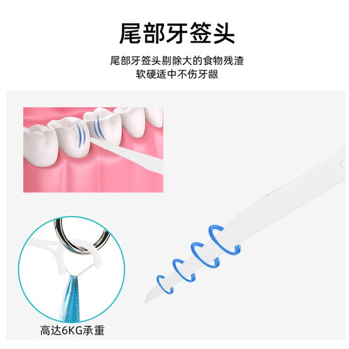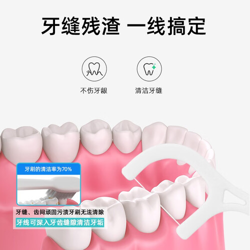 牙线纤细有韧性,不会伤害牙齿,清洁更到位;独立包装设计,方便携带,随时随地清洁牙齿;手柄握感舒适,不易手滑,使用更安全。