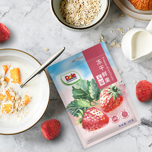 原产地鲜采12小时内速冻,在真空状态下24小时慢脱水,锁住草莓的本味,整颗新鲜的草莓,纯正无负担。