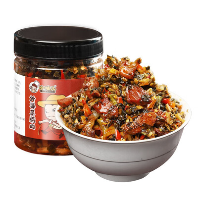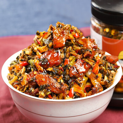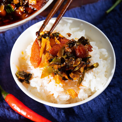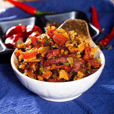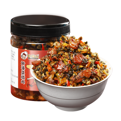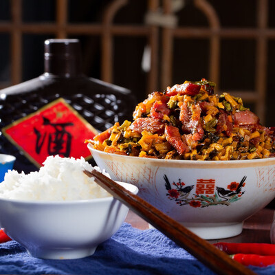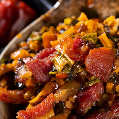 一款地道湖南家乡风味的下饭菜,选用梅干菜和茶香腊肉的经典搭配,入口伴随着浓浓的熏香味,口感鲜香爽脆、油而不腻。