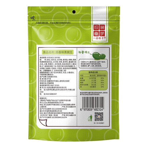 精选优质青豆为原料,再经过秘制调味,使得青豆更加酥脆,口感鲜香,丝丝蒜香味与青豆融合,令你回味无穷。