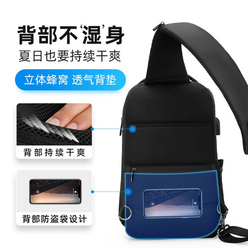 背部采用立体蜂窝设计,具有良好的透气性,背负干爽舒适。外置充电接口,方便随时为手机续航。背部拉链袋,安全防盗。