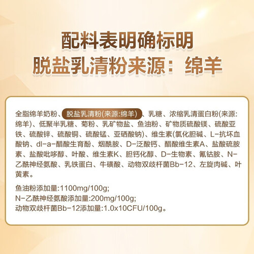 添加进口金枪鱼油和叶黄素成分,有效呵护宝宝双眼,让眼睛更明亮。甄选绵羊奶,含更多天然营养,助力宝宝成长。