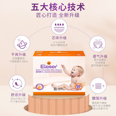 细腻纤维制作,丝滑柔软,全力为初生肌肤护航。内置进口吸收高分子,大大提高吸水能力,整晚安睡无忧。