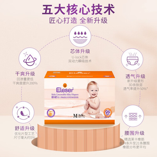 采用超声波菱形3D复合面层材质,高透气让肌肤自由呼吸。新升级U-lock芯体,双动力瞬吸技术,减少宝宝不适感。
