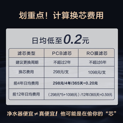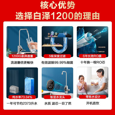 1200G大容量,滴滴纯净,口口健康,从容应对用水高峰。6年长效滤芯,有效过滤畅饮无忧,省钱又省心。